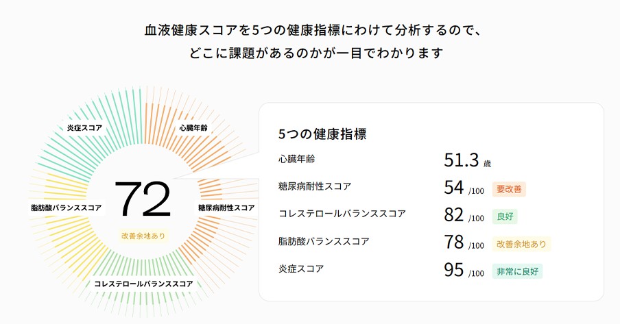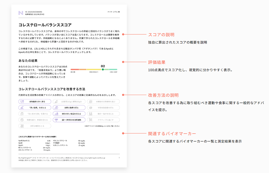 検査結果のレポートにそれぞれの健康指標スコアを改善するための具体的なアドバイスが示されるため、行動に移しやすいという特徴があります。アドバイスには、生活の節制だけでなくアクティブな活動や良質な睡眠を勧める内容も盛り込まれており、前向きに取り組めるよう工夫されています。