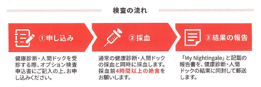 My Nightingale(マイナイチンゲール)検査は、通常の血液検査では測定しない250項目の血液データを測定し、スコア化することで、生活習慣病の発症リスクを評価する検査です。生活習慣病は、日常生活の習慣の積み重ねによって発症し、少しずつ進行しますので、将来的な評価を把握し、生活習慣の改善に役立てることができます。
