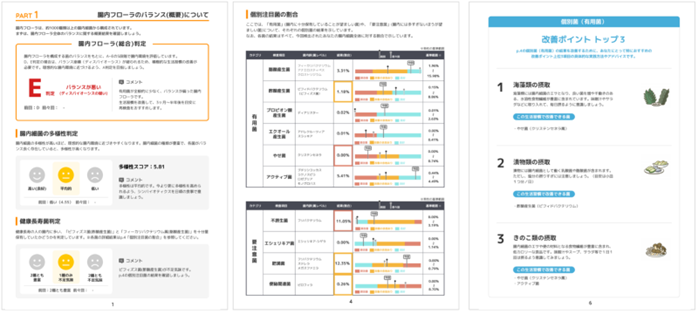 腸内フローラの総合判定や生活習慣病等の疾患別リスク判定、有用菌や要注意菌などの結果が分かります。菌の結果に合わせてカスタマイズされた、改善アドバイス(管理栄養士監修)もついています。